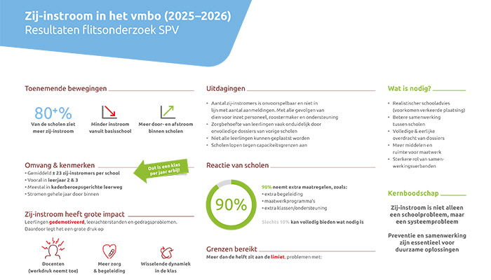 De instroom heeft grote gevolgen: voor de leerlingen zelf, hun klasgenoten, docenten, de schoolorganisatie en de onderwijskwaliteit. Het vmbo doet er alles aan om zoveel mogelijk leerlingen op te vangen, maar loopt daarbij tegen grenzen aan. Ook speelt mee dat bij zij-instromers vaak slechts beperkte overdrachtsinformatie beschikbaar is.