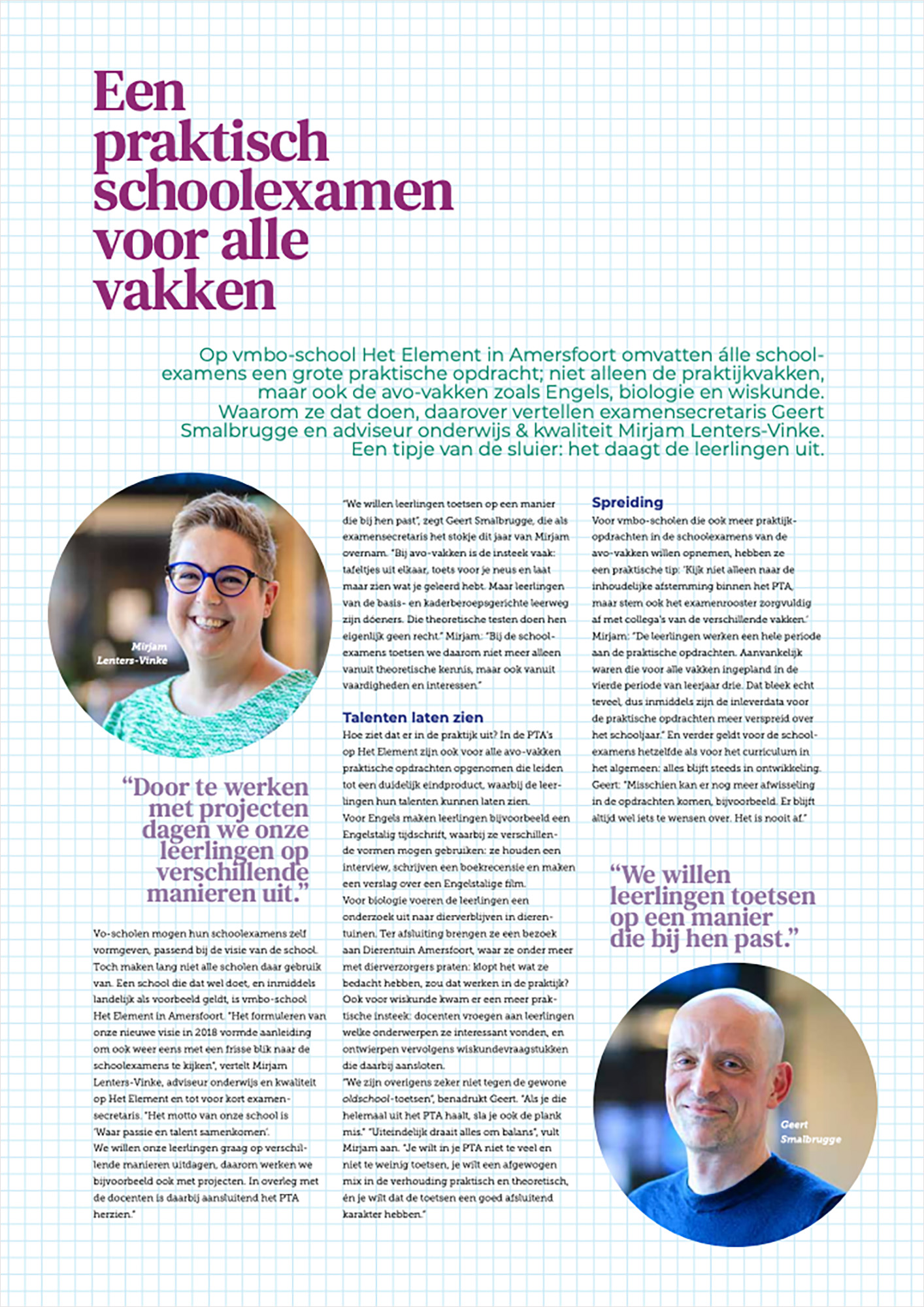 Op vmbo-school Het Element in Amersfoort omvatten álle schoolexamens een grote praktische opdracht; niet alleen de praktijkvakken, maar ook de avo-vakken zoals Engels, biologie en wiskunde. Waarom ze dat doen, daarover vertellen examensecretaris Geert Smalbrugge en adviseur onderwijs & kwaliteit Mirjam Lenters-Vinke. Een tipje van de sluier: het daagt de leerlingen uit.