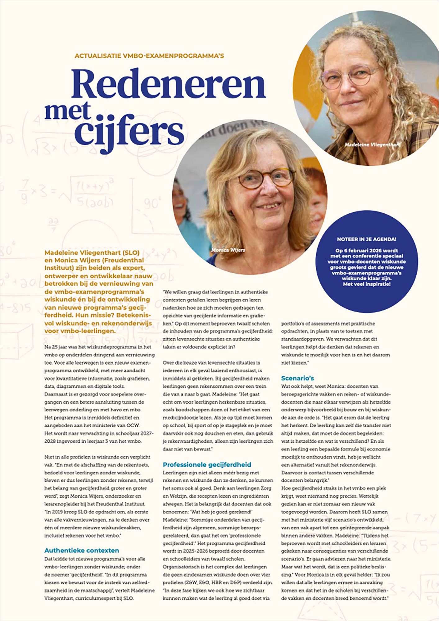 Madeleine Vliegenthart (SLO) en Monica Wijers (Freudenthal Instituut) zijn beiden als expert, ontwerper en ontwikkelaar nauw betrokken bij de vernieuwing van de vmbo-examenprogramma’s wiskunde én bij de ontwikkeling van nieuwe programma’s gecijferdheid. Hun missie? Betekenisvol wiskunde- en rekenonderwijs voor vmbo-leerlingen.