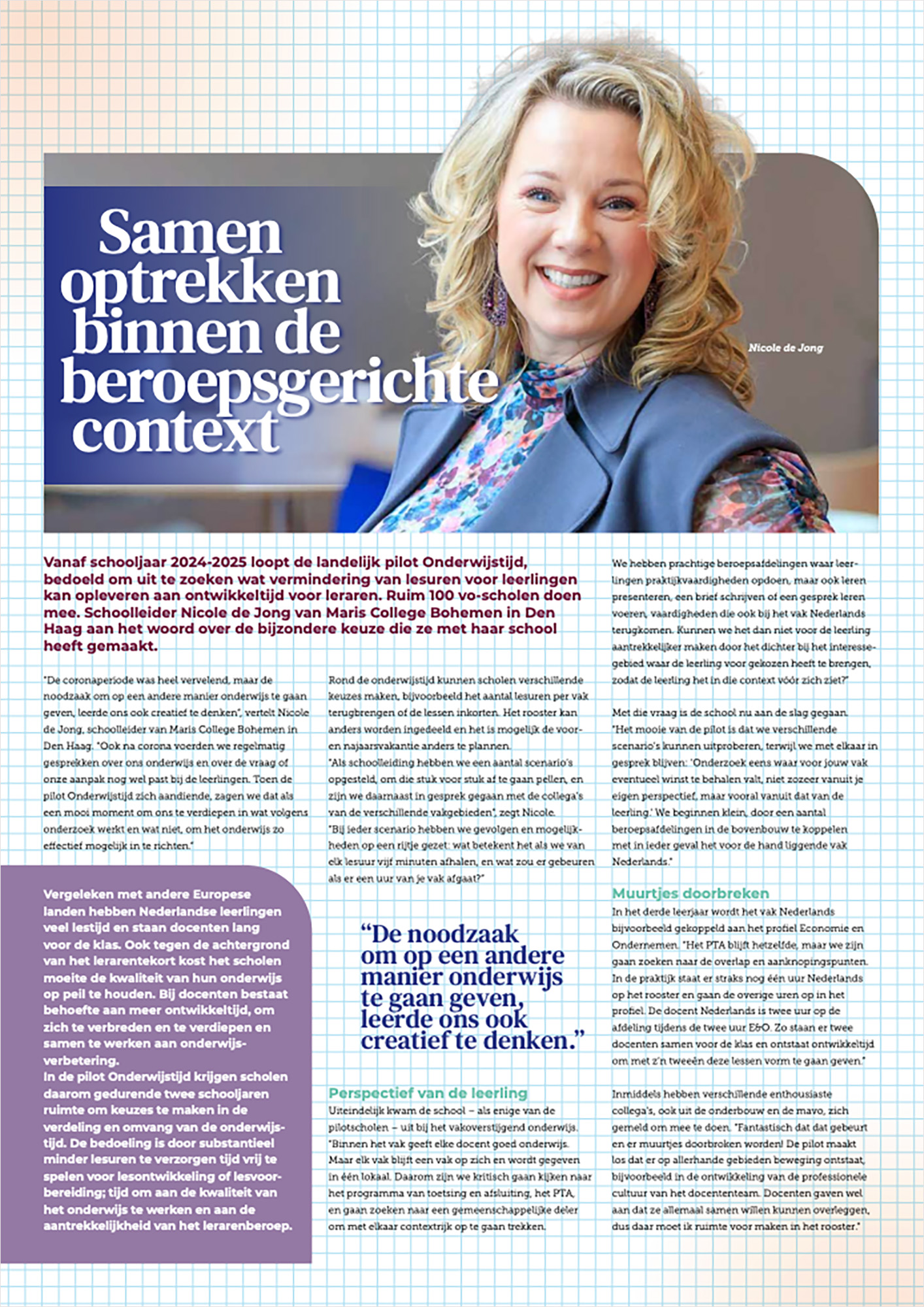 Vanaf schooljaar 2024-2025 loopt de landelijk pilot Onderwijstijd, bedoeld om uit te zoeken wat vermindering van lesuren voor leerlingen kan opleveren aan ontwikkeltijd voor leraren. Ruim 100 vo-scholen doen mee. Schoolleider Nicole de Jong van Maris College Bohemen in Den Haag aan het woord over de bijzondere keuze die ze met haar school heeft gemaakt.